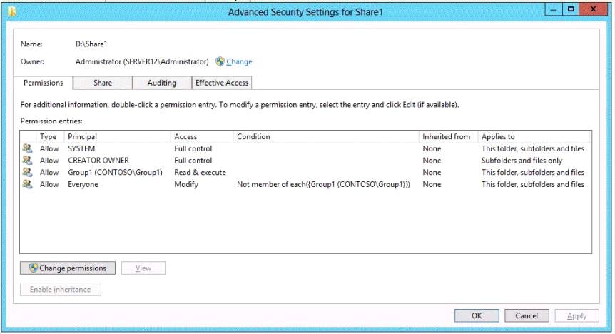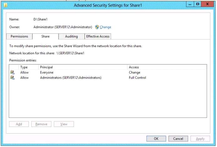 You have a shared folder named Share1. The folder permissions of Share1 are configured as shown