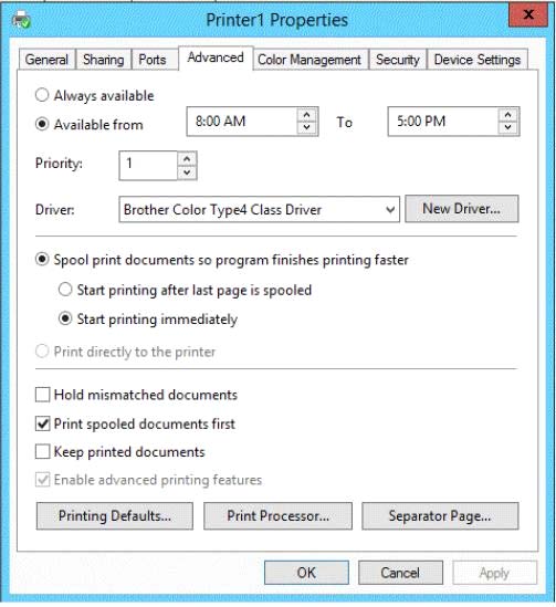 The Advanced settings of Printer1 are shown in the Advanced exhibit. (Click the Exhibit button.)
