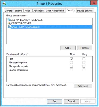 The Security settings of Printer1 are shown in the Security exhibit. (Click the Exhibit button.)