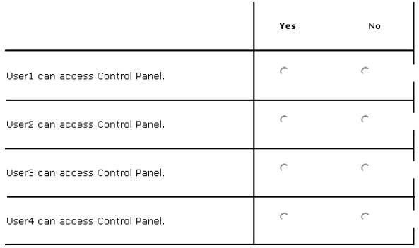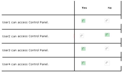 Group Policy does NOT APPLY TO SECURITY GROUPS, only users, and computers IN an OU. Consequently, the only users in the OU are User2 and User4. Since the Security Filtering specifies that the policy will only apply to users/computers in the OU who are members of Group1 or User3, User4 will not have the policy applied. Since User2 is, in fact, a member of Group1, the policy will be applied to user 2. Thus, the only user who will not be able to access the control panel is User2. Same with User 3, he is not a member in any OU and as long as this group policy does NOT apply to users, so User 3 will have access to control panel as well. So the correct answer is YNYY