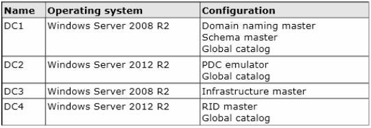 contoso.com. The domain contains four domain controllers. The domain controllers are configured
