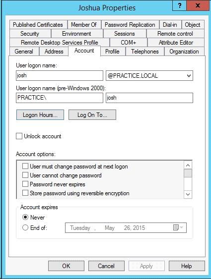 4. On the Account tab, click Logon Hours, and then set the permitted or denied logon hours for the