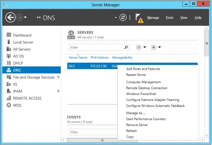 From Server Manager on Server1, you right-click DC2 as shown in the exhibit. (Click the Exhibit