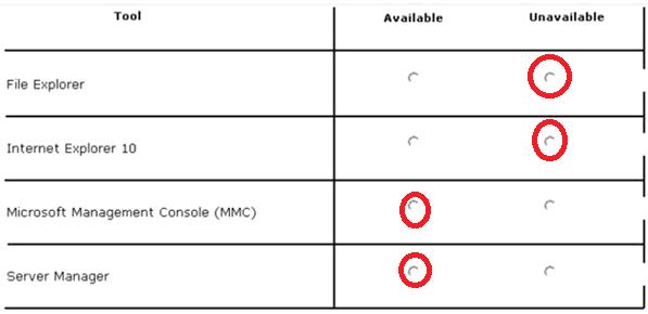 In the table below, identify which tools are available on Server1 and which tools are unavailable on