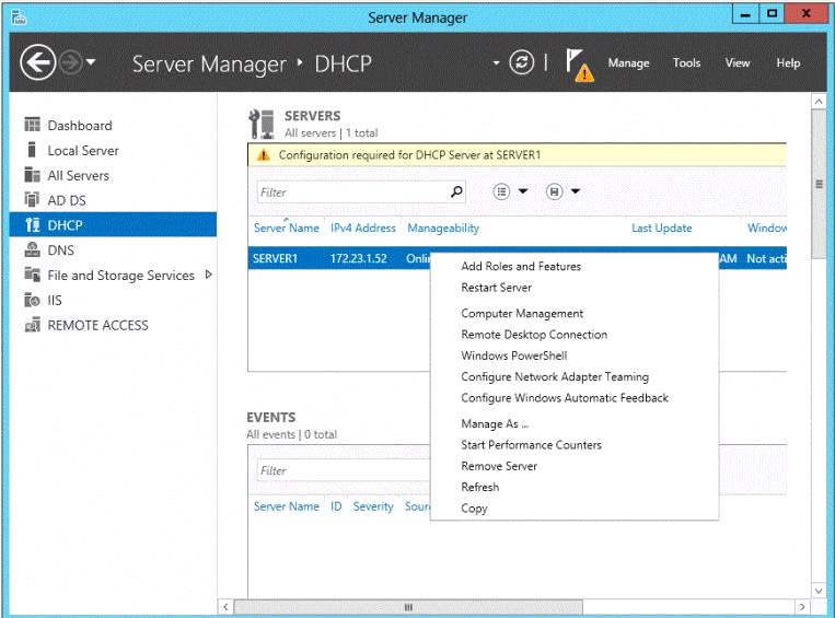 You need to ensure that when you right-click Server1, you see the option to run the DHCP console.