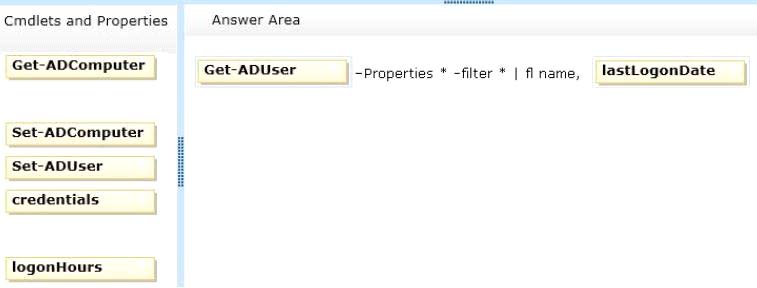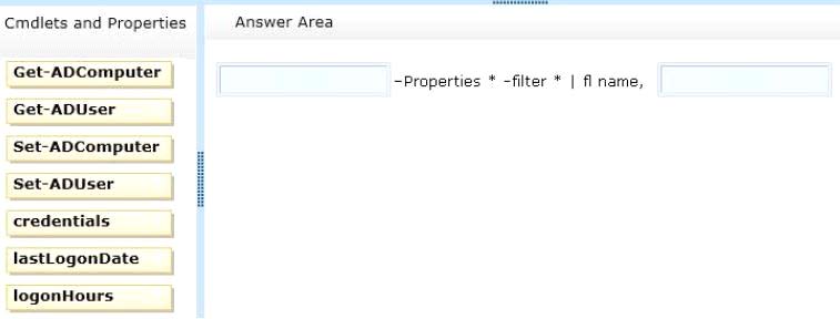 To answer, drag the appropriate cmdlet or property to the correct locations to complete the