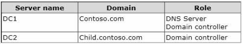 domains named contoso.com and child.contoso.com. The forest contains two domain controllers.
