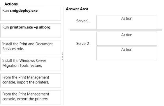 To answer, drag the appropriate action to the correct servers in the answer area. Each action may be