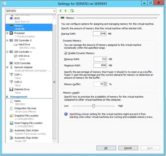 The settings of a virtual machine named Server3 are configured as shown in the exhibit. (Click the