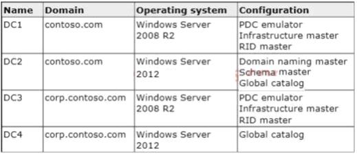contoso.com and corp.contoso.com. The forest contains four domain controllers. The domain