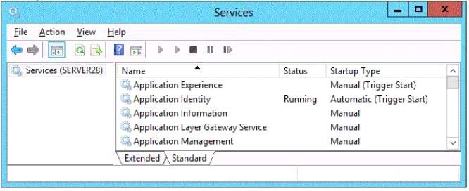 The Services console on Server28 is shown in the Services exhibit. (Click the Exhibit button.)