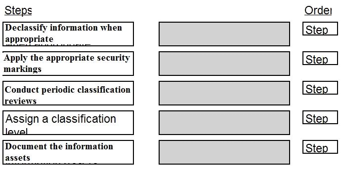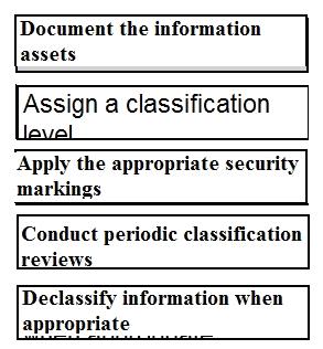 Place the following information classification steps in sequential order. DRAG DROPPlace the following information classification steps in sequential order. DRAG DROPPlace the following information classification steps in sequential order. Answer: Show Hint ← Previous question Next question →