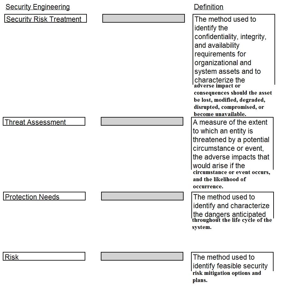 Drag the following Security Engineering terms on the left to the BEST definition on the right.