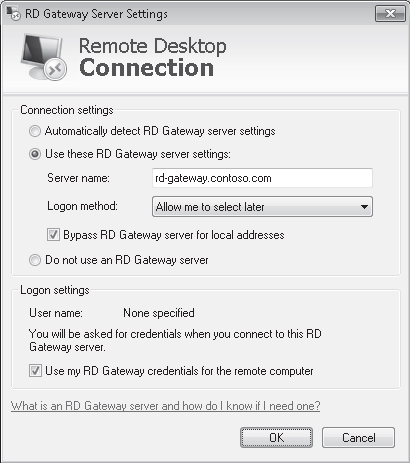 the firgure, or you can specify Do Not Use an RD Gateway Server, which is the default setting.
