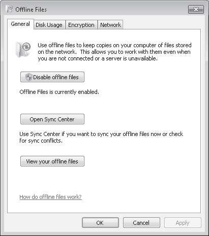 also available using the Offline Files control panel. Using this dialog box, you can disable offline files, view