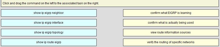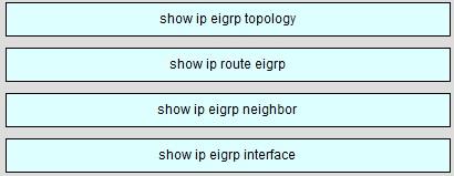 Marek show ip eigrp topology – confirm what eigrp is learning show ip route eigrp – verify the routing of specific network show ip eigrp neighbor – view route information source shwo ip eigrp interface – confirm what actually being used Reply