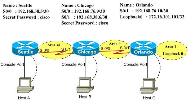 network 192.168.34.6 0.0.0.0 area 8You have to configure area 8 stub on seattle router and no-summary on Chicago router. This