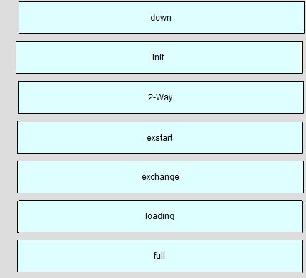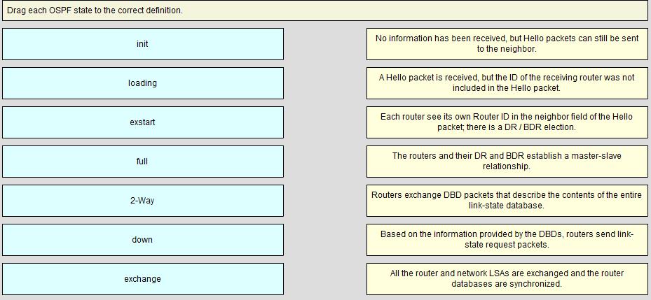 Drag each OSPF state to the correct definition. DRAG DROPDrag each OSPF state to the correct definition. DRAG DROPDrag each OSPF state to the correct definition. Answer: Explanation: Show Hint ← Previous question Next question →