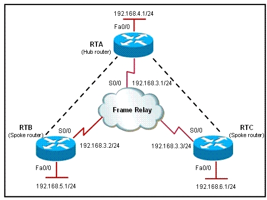 Router RTA is the hub router for routers RTB and RTC. The Frame