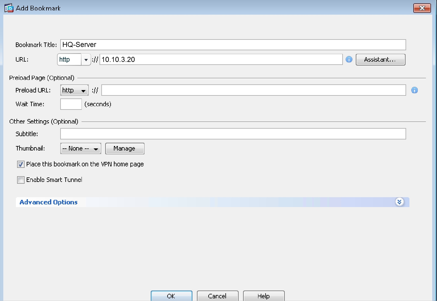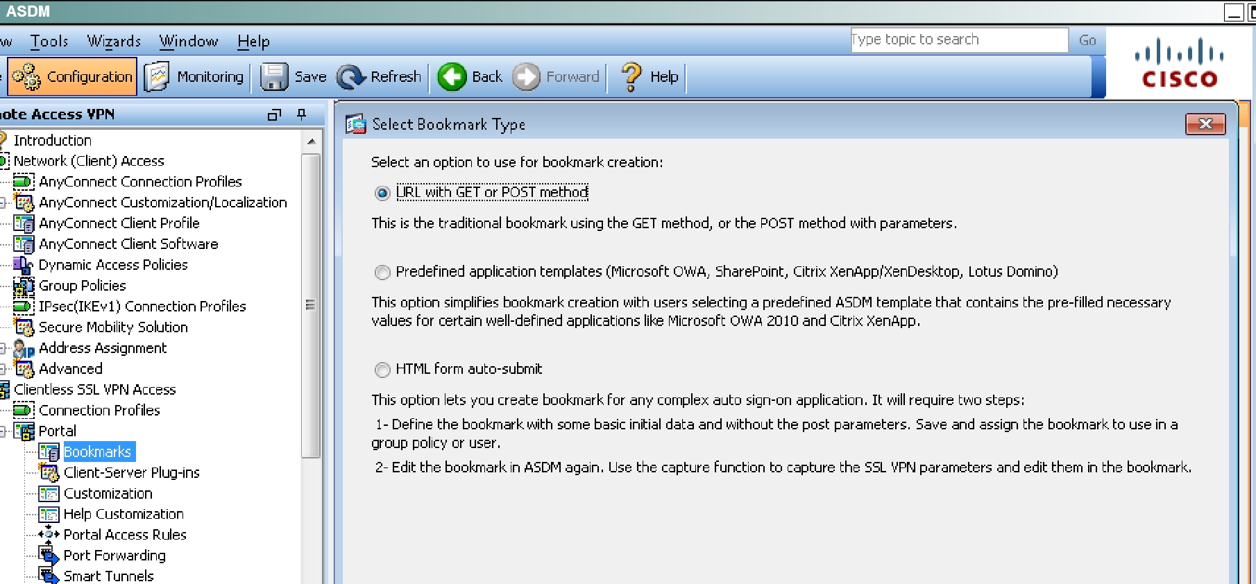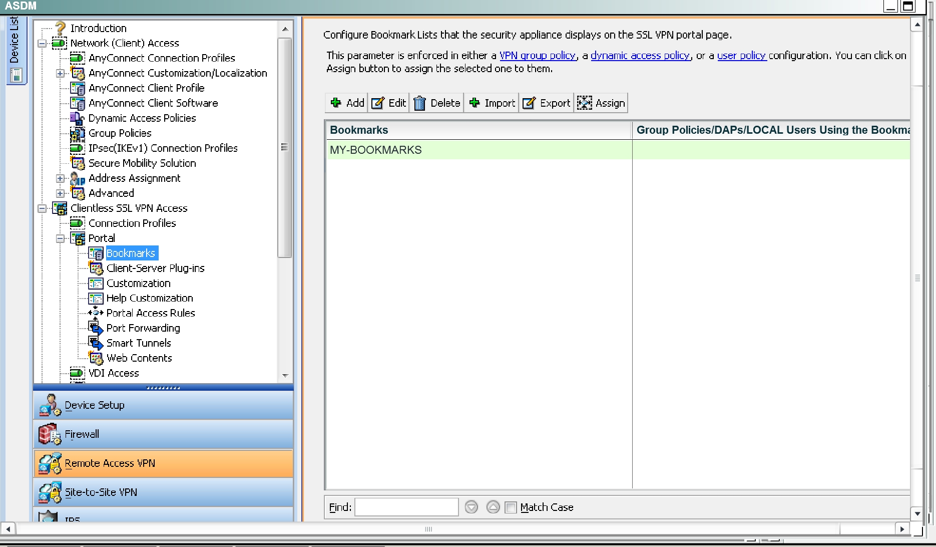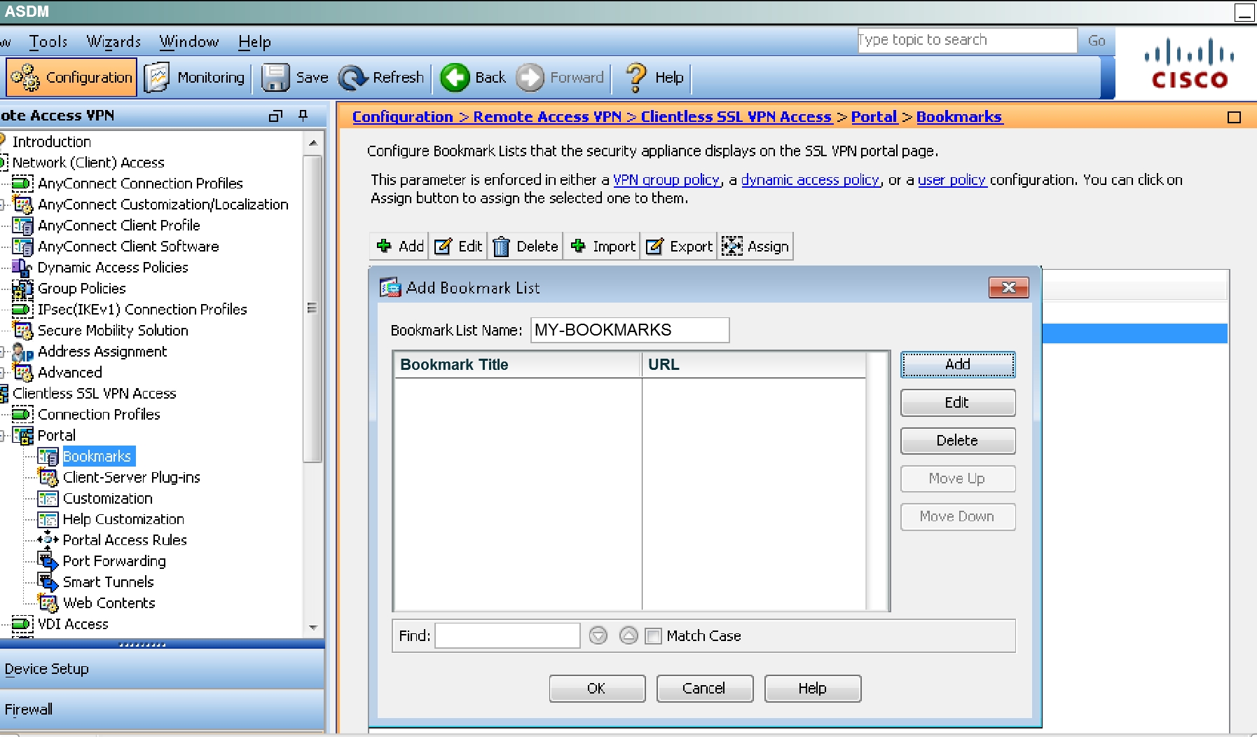 Now, go back to the ASDM and navigate to the Bookmarks portion:Make the name MY-BOOKMARKS and use the “Add” tab and add the bookmarks per the