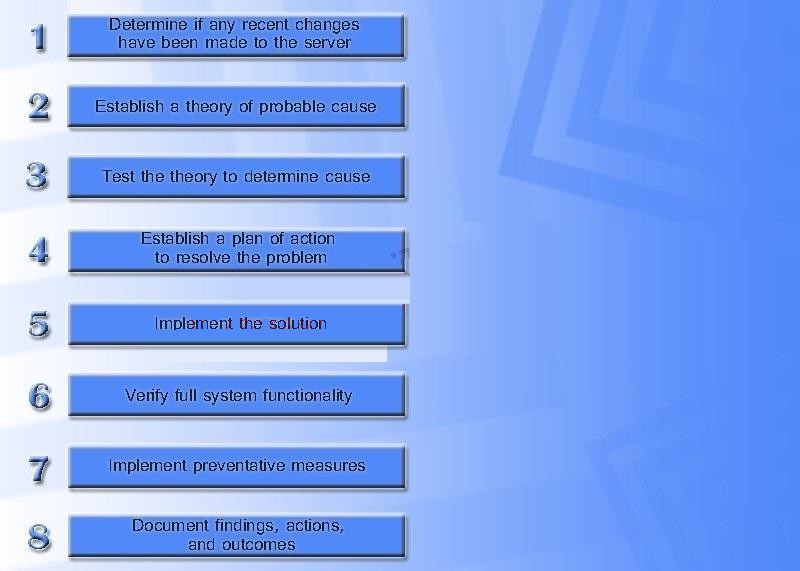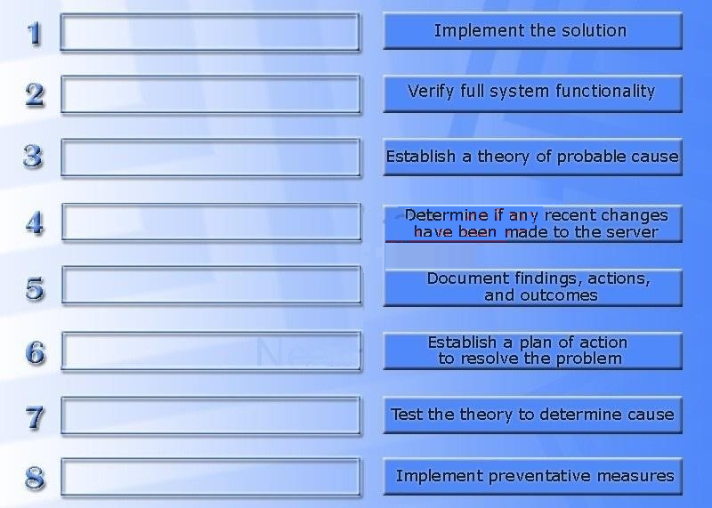 Arrange the troubleshooting steps in the order the technician should perform them: A customer’s email server is not sending emails. Arrange the troubleshooting steps in the order the technicianshould perform them: A customer’s email server is not sending emails. Arrange the troubleshooting steps in the order the technicianshould perform them: Answer: Explanation: Show Hint ← Previous question Next question →