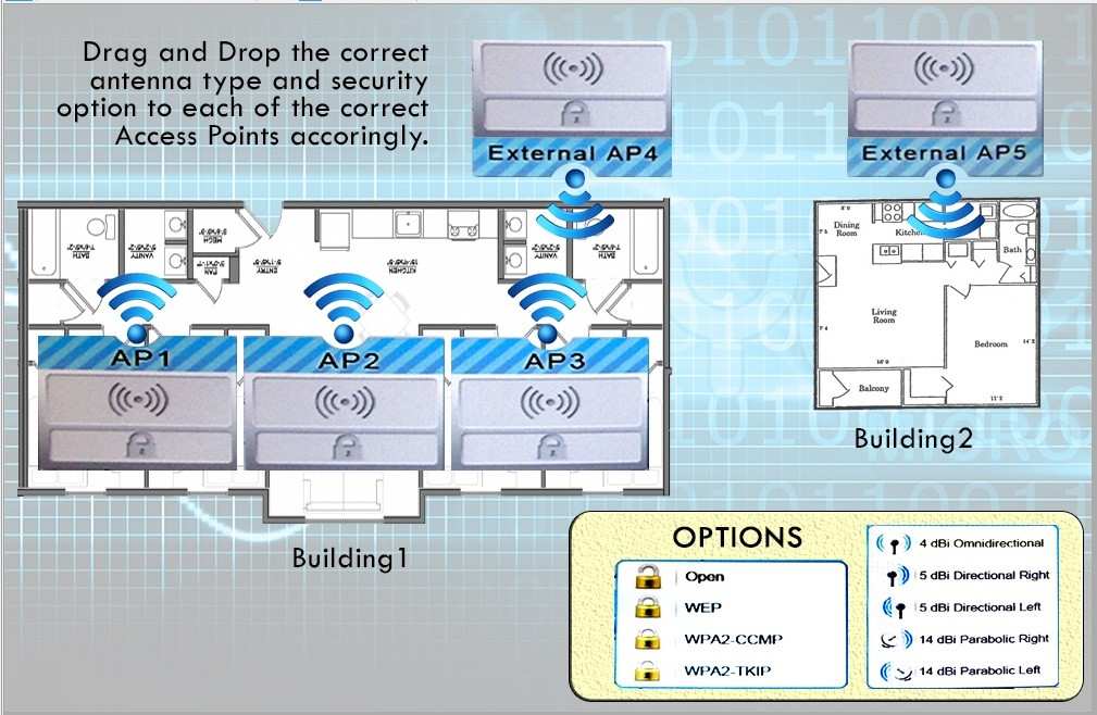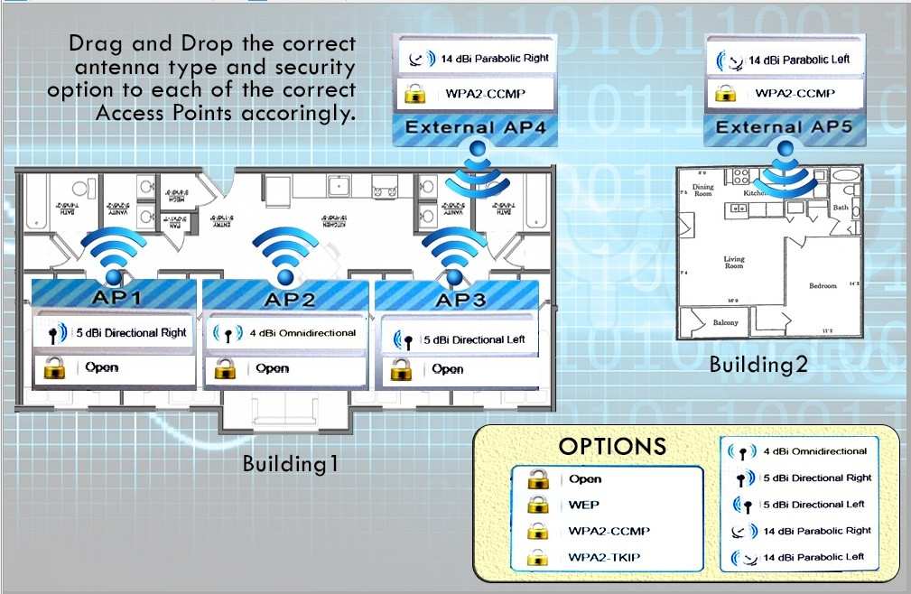 For each of the tasks below, select the appropriate antenna type and encryption object for all wireless access point (AP).