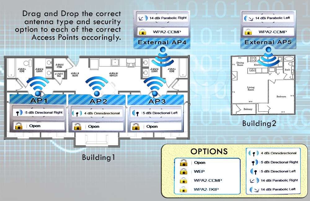For each of the tasks below, select the appropriate antenna type and encryption object for all wireless access