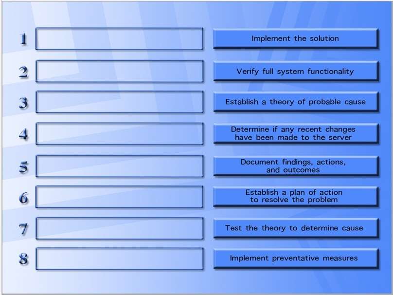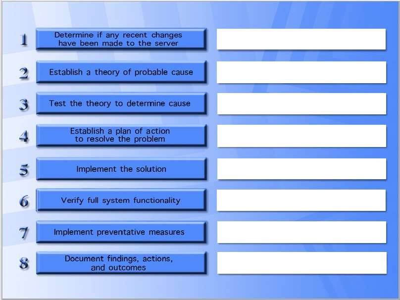 A customer’s email server is not sending emails. Arrange the troubleshooting steps in the order the technician