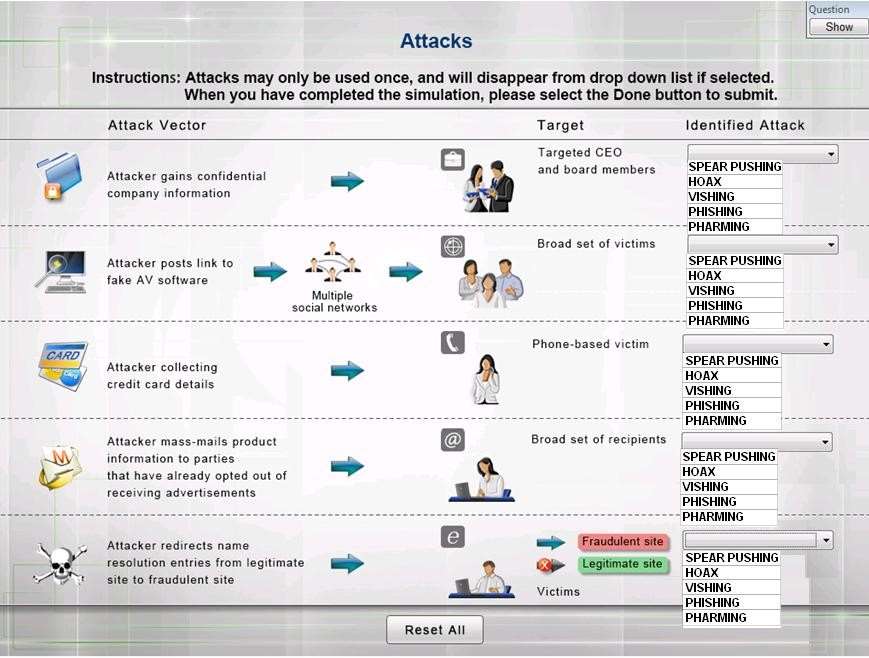 Select the appropriate attack from each drop down list to label the corresponding illustrated attack