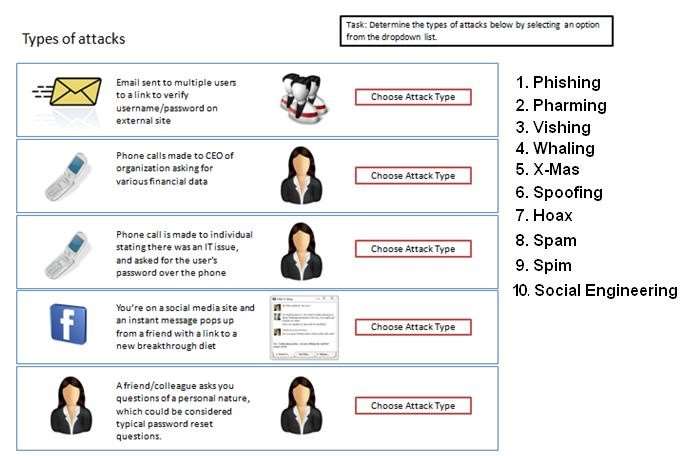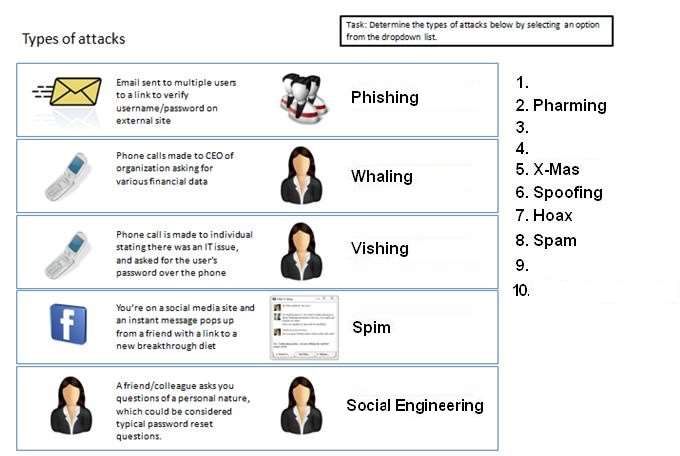 Determine the types of attacks below by selecting an option from the dropdown list.