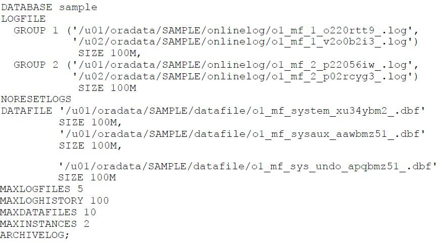 The following CREATE CONTROLFILE statement is generated by an ALTER DATABASE