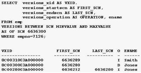 The query uses Oracle Flashback Version Query pseudocolumns: