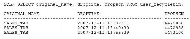 Examine the output of the query that you executed to list the objects in the recycle bin: