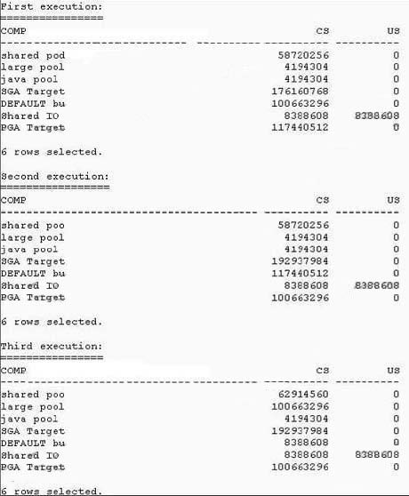 SQL> SELECT substr(component, 0, 10) COMP, current_size CS, user_specified_size US