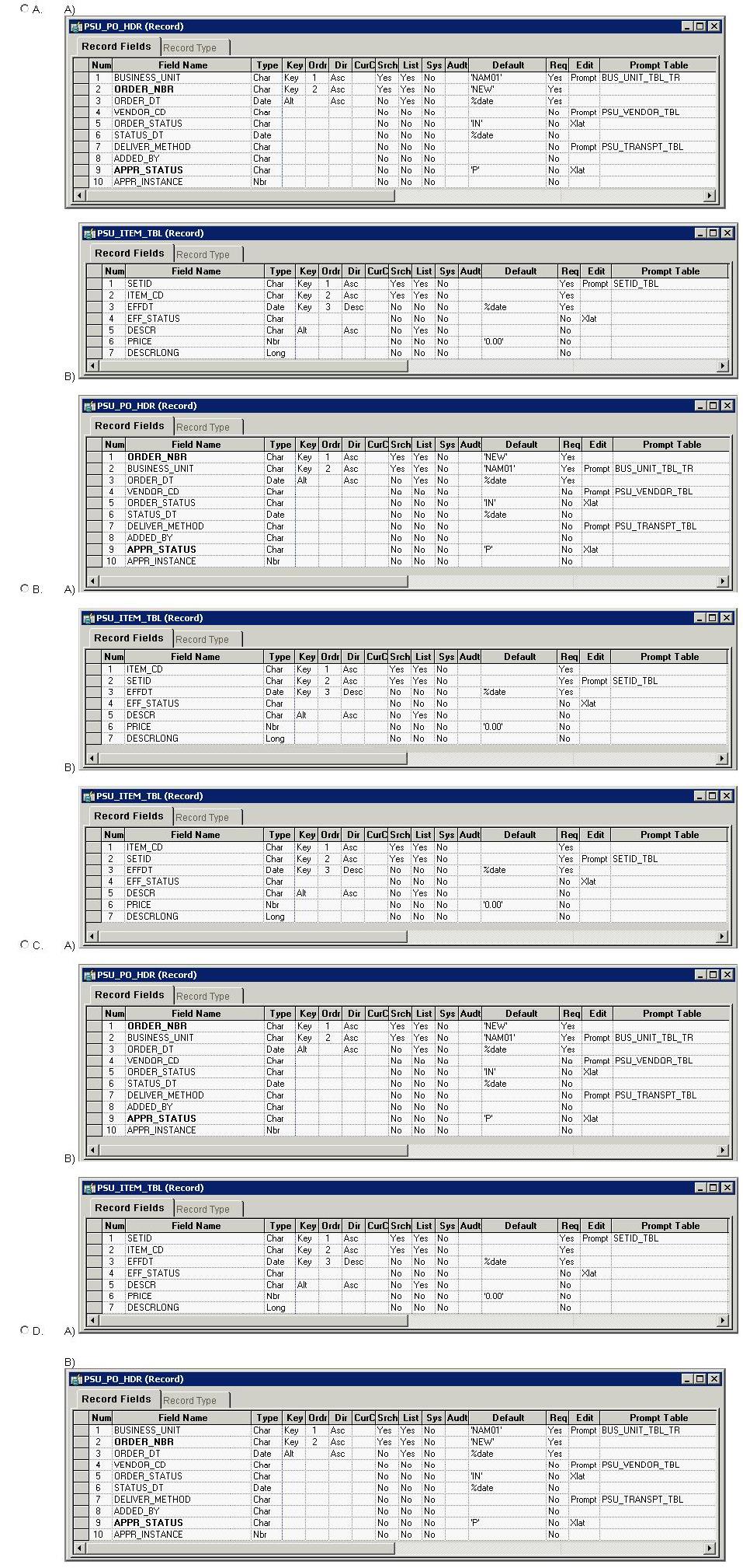 Select the record definitions that are correctly configured as A) a control table and B) a transaction