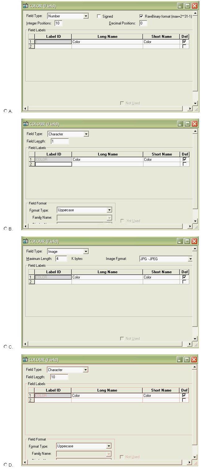 Select the field that might have associated translate values. Select the field that might have associated translate values. A. Exhibit A B. Exhibit B C. Exhibit C D. Exhibit D Show Hint ← Previous question Next question →