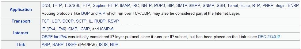 The following table provides some examples of the protocols grouped in their respective layers.