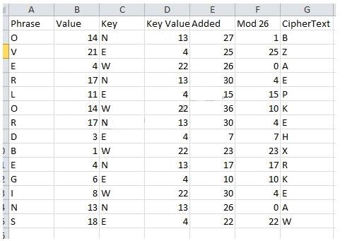 Adding the key repetitively to OVERLORD BEGINS modulo 26