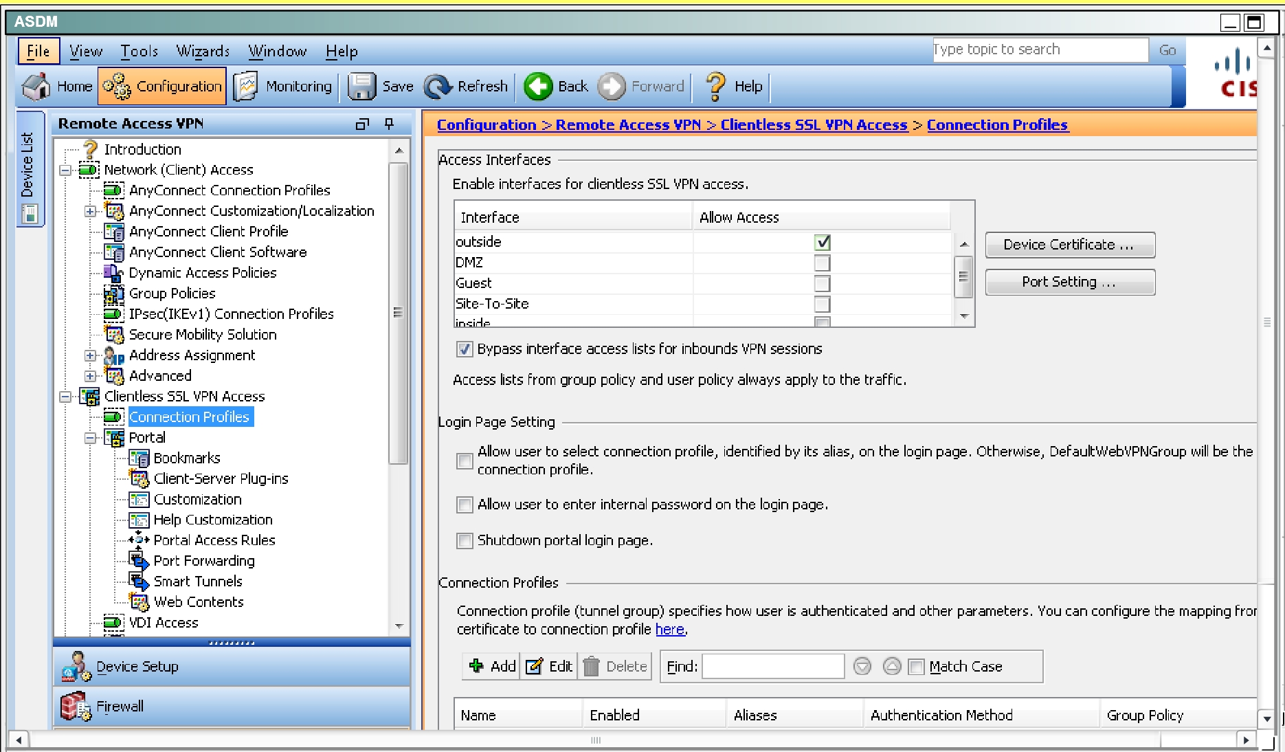 First, enable clientless VPN access on the outside interface by checking the box found below: