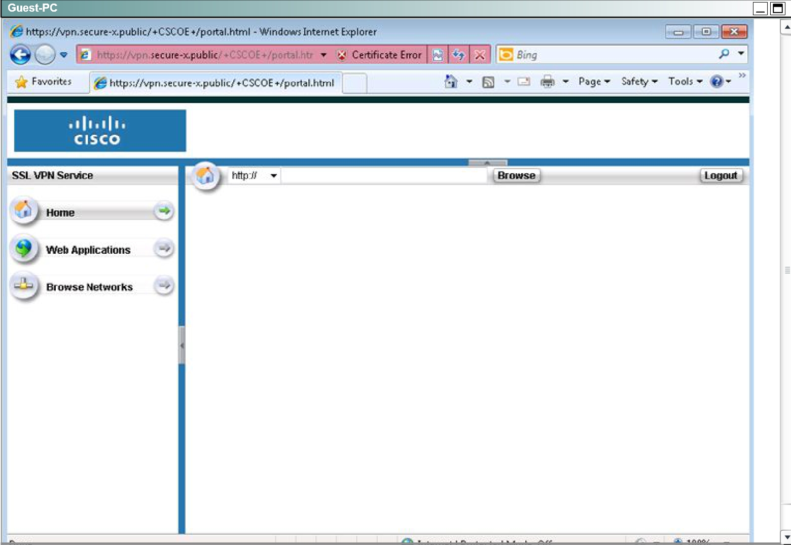 • Using the Guest PC, open an Internet Explorer window and test and verify the basic