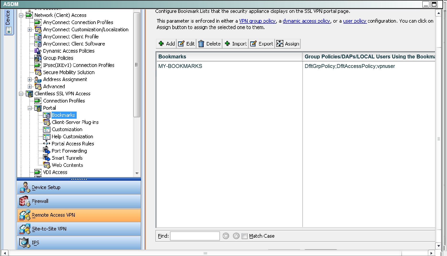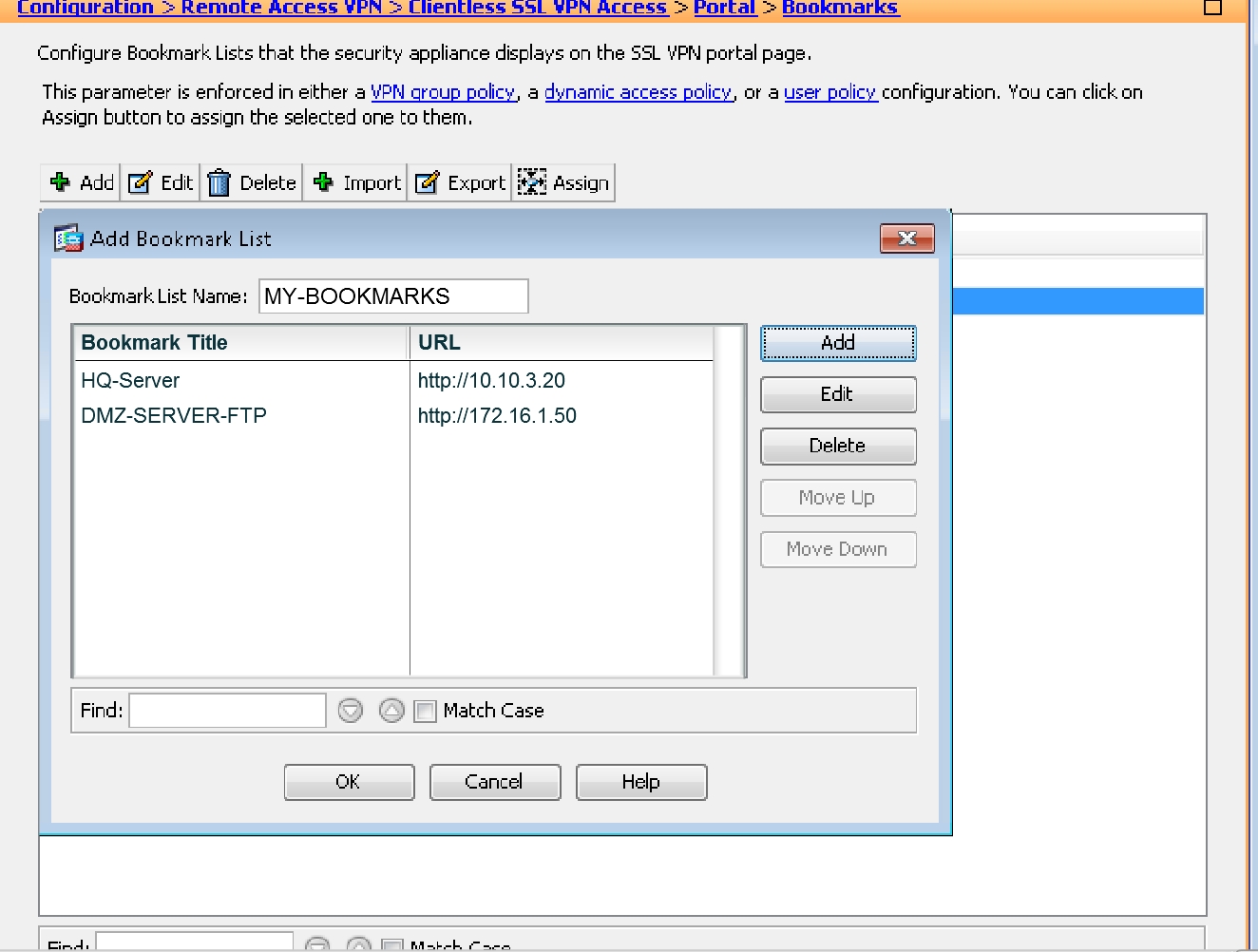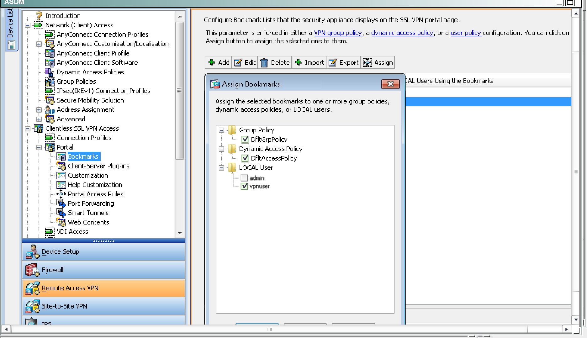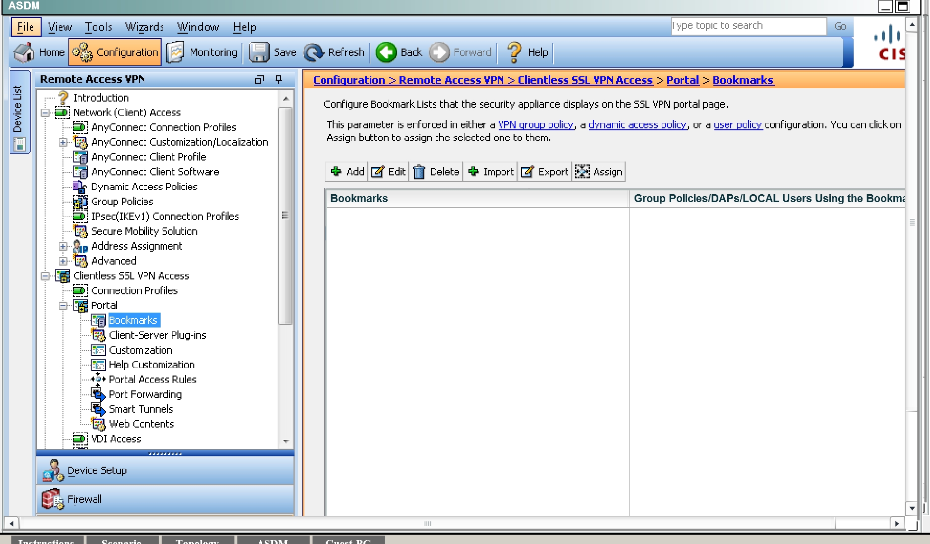 Now, go back to the ASDM and navigate to the Bookmarks portion: